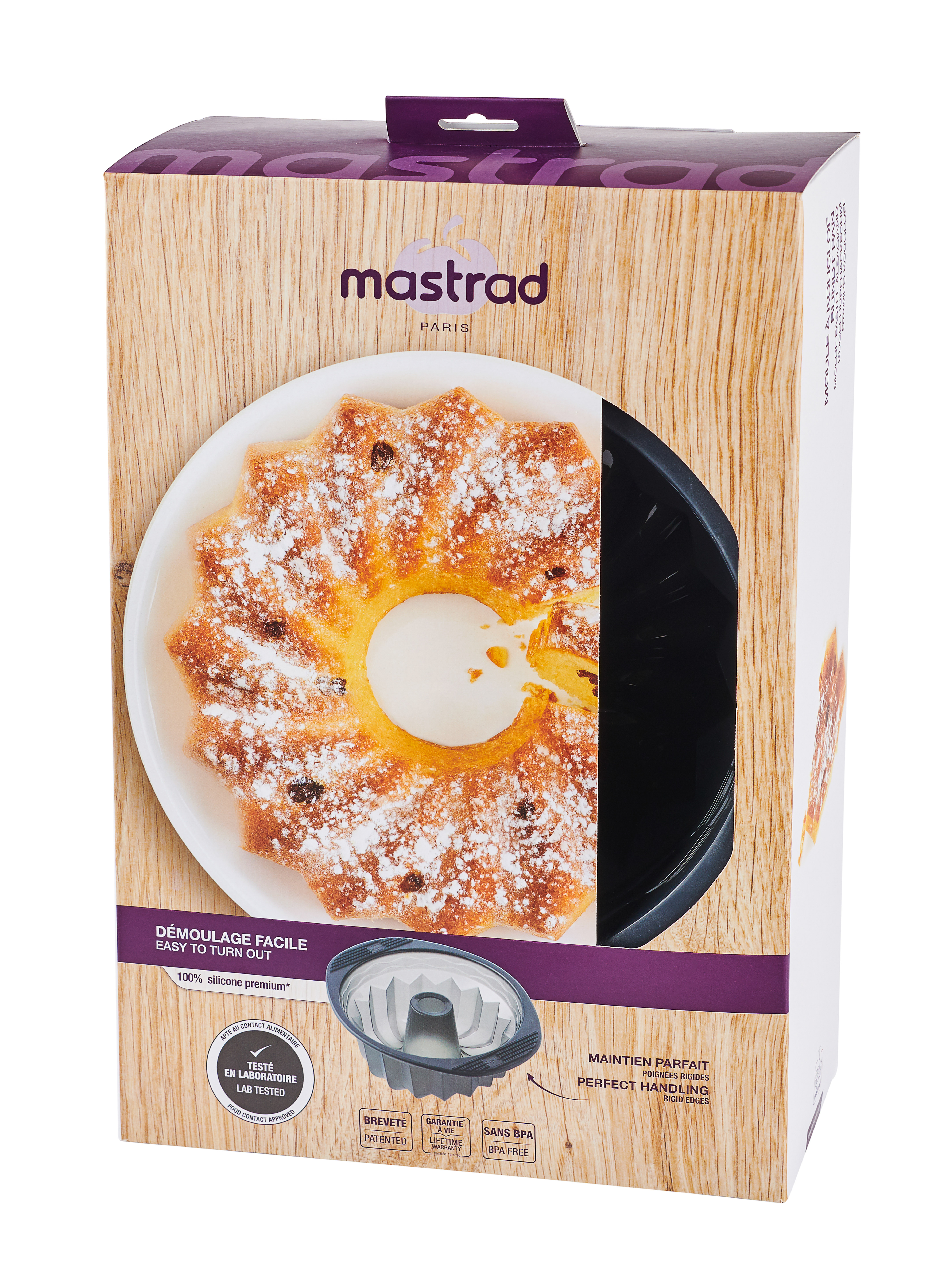Mastrad-kakkuvuoka on valmistettu kestävästä, erittäin laadukkaasta silikonista, ja siinä on tukevat kahvat, jotka vakauttavat käsittelyä ja tekevät varsinkin kuuman vuoan siirtelystä turvallisempaa. Leivonnaiset on helppo irrottaa joustavasta ja kevyestä vuoasta. Vuoan mitat ovat 29,5 x 24 x 10,5 cm ja sisähalkaisija 22 cm. Tilavuus 1800 ml. Vuokaa voidaan käyttää sekä uunissa (max 220°C) että pakastimessa (max -40°C). Vuoka on konepesun kestävä.