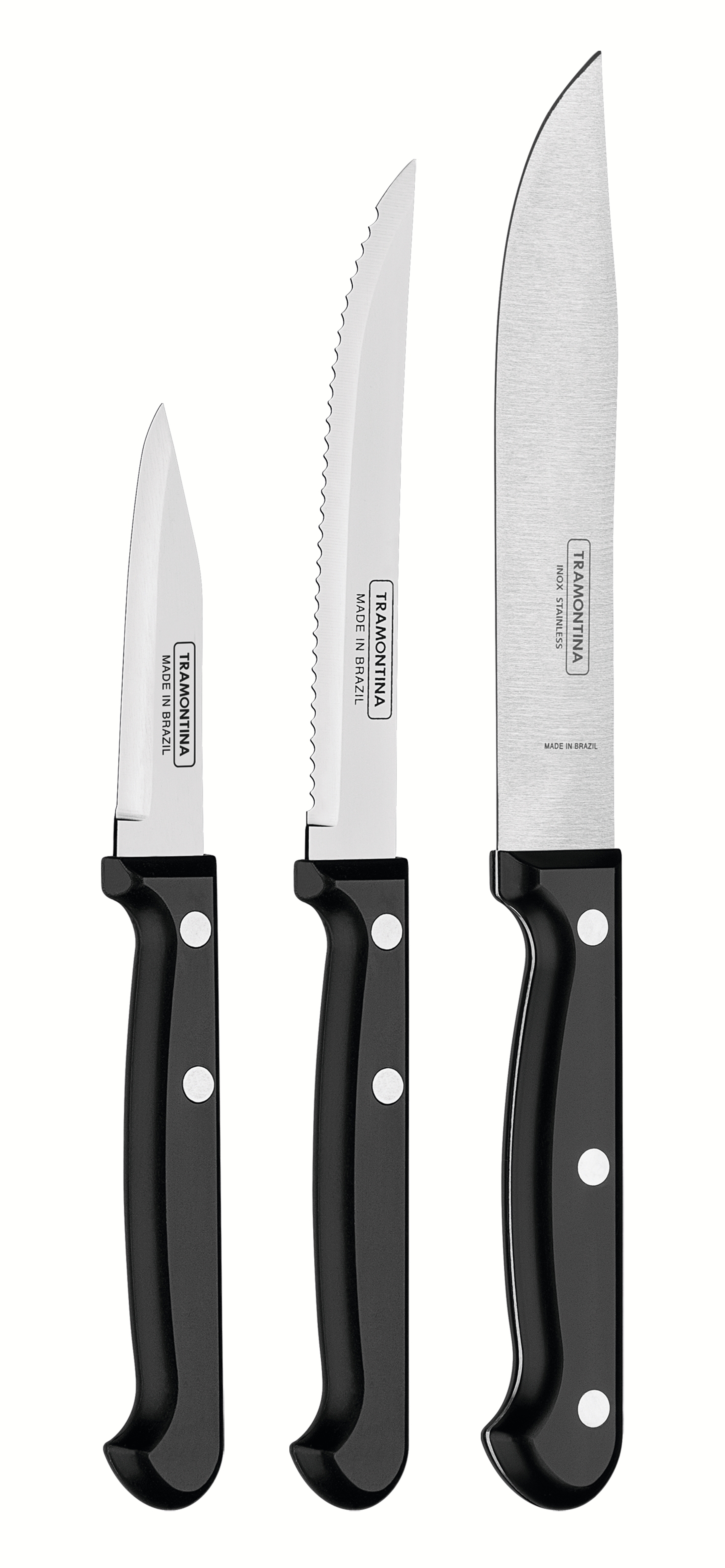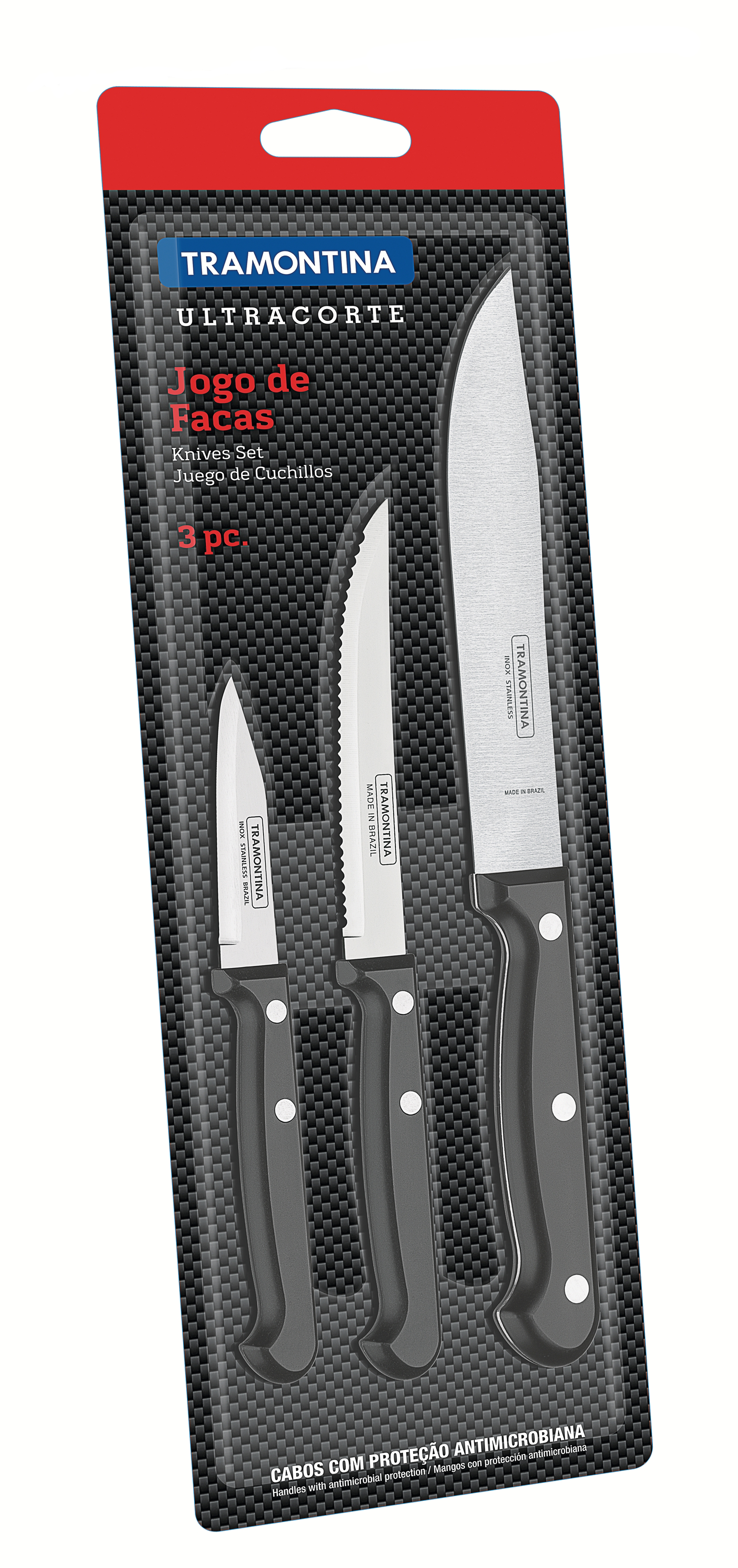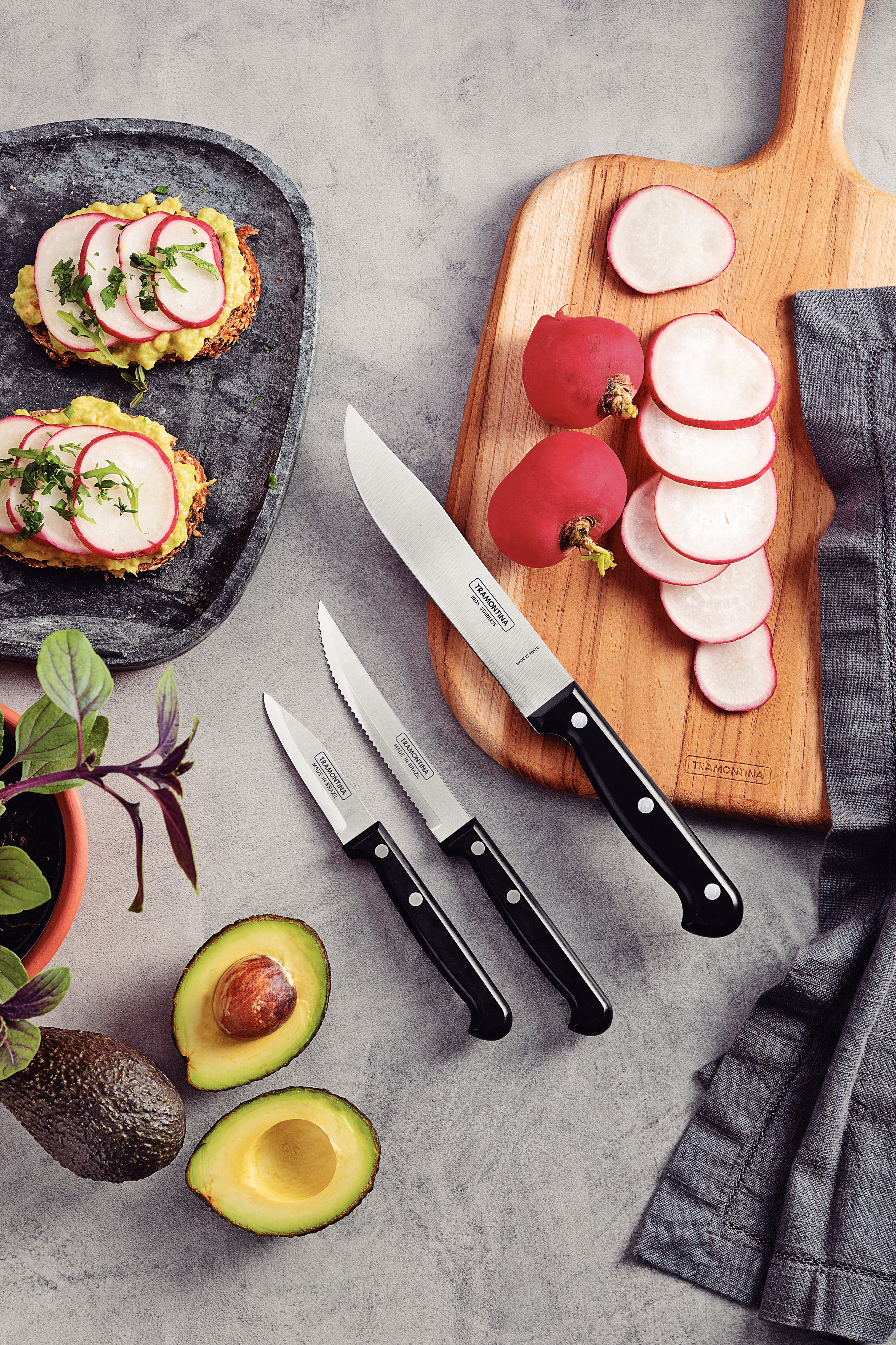 Tramontinan monikäyttöinen ja korkealaatuinen Ultracorte-veitsisetti on loistava apu päivittäisessä ruoanlaitossa. Ruostumattomasta teräksestä valmistetut lämpökäsitellyt terät takaavat erinomaisen kestävyyden ja terävyyden. Mustat polypropeenikahvat sisältävät antimikrobisen suojan, joka estää bakteerien ja sienien kasvua. Veitset ovat ergonomisia, helppoja puhdistaa ja konepesun kestäviä.