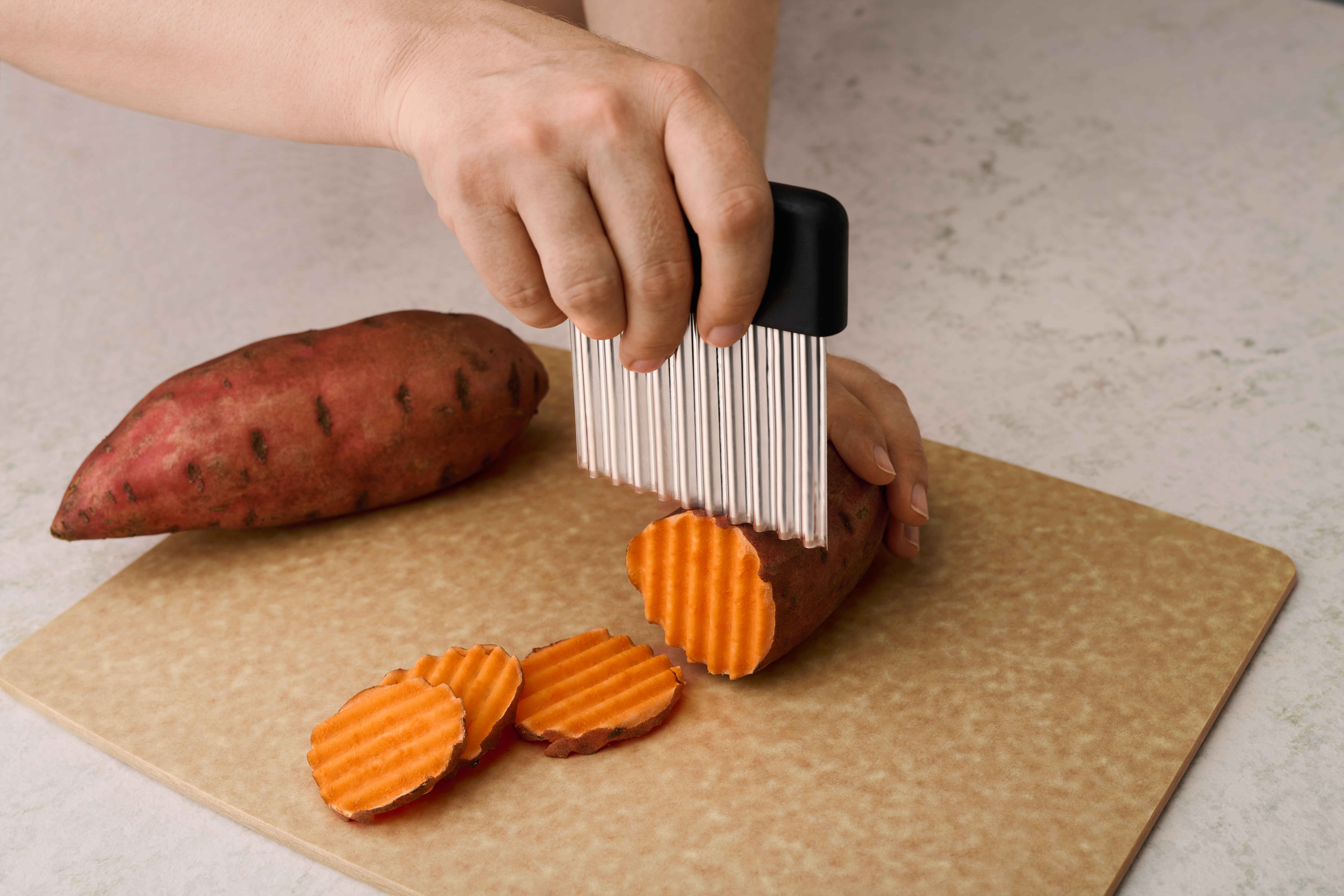 Aaltoteräleikkurilla on helppo leikata klassisia aaltoviipaleita perunasta ja juureksista, mutta se on oivallinen apuri monien muidenkin raaka-aineiden koristelussa. Kokeile esim. juuston paloitteluun, voin koristeluun tai kakkukuorrutteen levittämiseen. Tukeva muotoilu ja ergonominen kahva mahdollistavat hyvän, turvallisen otteen. Valmistettu Sveitsissä. Kestää konepesun.