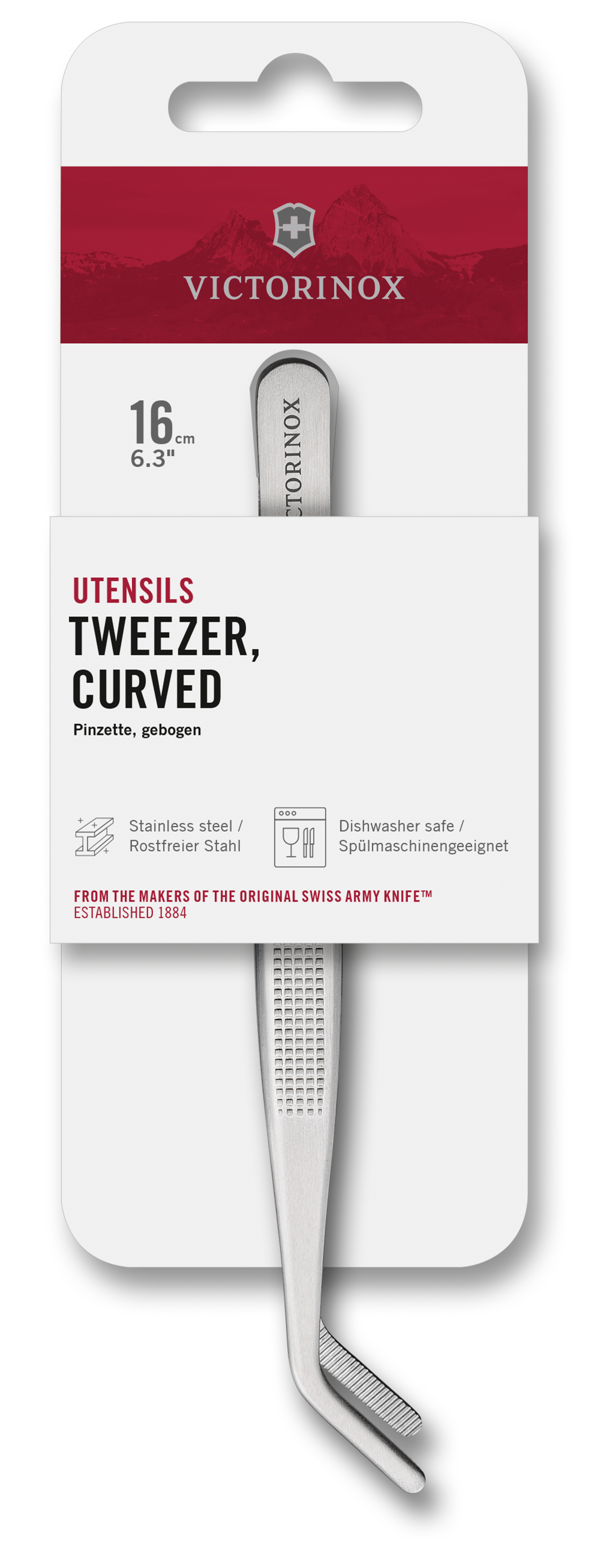 Victorinoxin keittiöpinsettien muotoilu mahdollistaa pienten ja hentojen koristeiden hellävaraisen asettelun annoksia viimeisteltäessä. Erittäin tarkat kärjet mahdollistavat äärimmäisen tarkan työskentelyn. Pinsettien ulkopinnan suomumainen tekstuuri on saanut innoituksensa Alox-linkkuveitsistä, ja takaa hyvän otteen. Pinsetit kestävät konepesun.