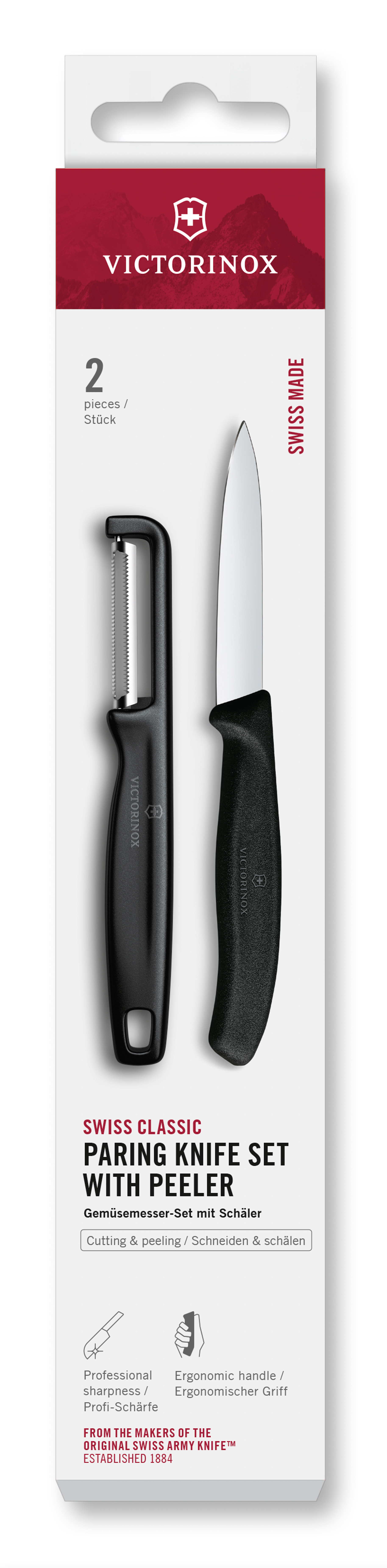 Kaksiosainen Swiss Classic -kuorimaveitsisetti helpottaa vihannesten ja hedelmien käsittelyä kuorimisesta viipalointiin - ja kaikkea siltä väliltä.
