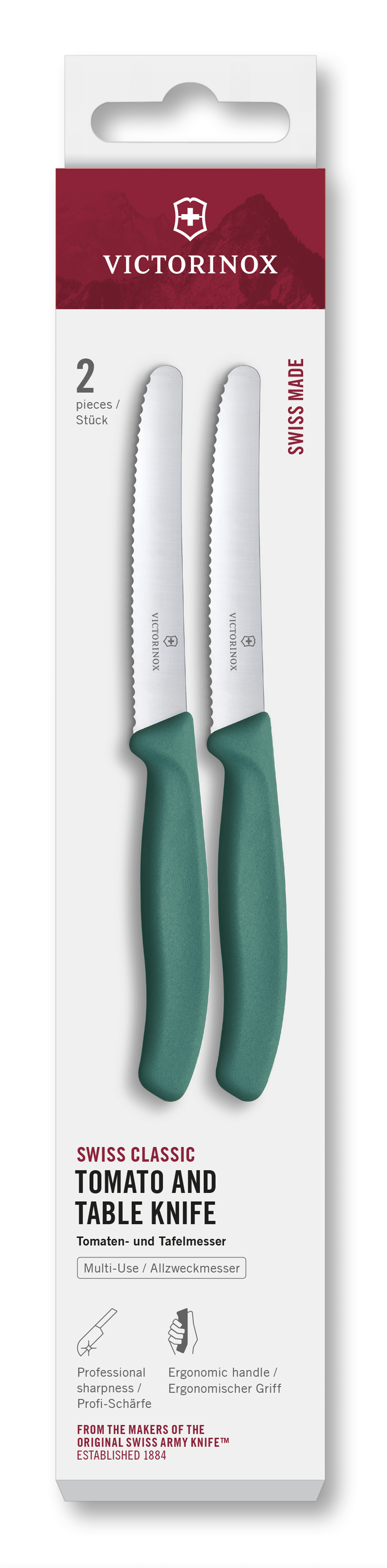 Victorinoxin legendaarinen sahalaitainen tomaattiveitsi sopii monenlaiseen käyttöön aina tomaattien ja muiden mehevien raaka-aineiden viipaloinnista tuoreiden sämpylöiden halkaisuun ja pizzan paloitteluun. Setti sisältää 2 kpl tomaattiveistä.