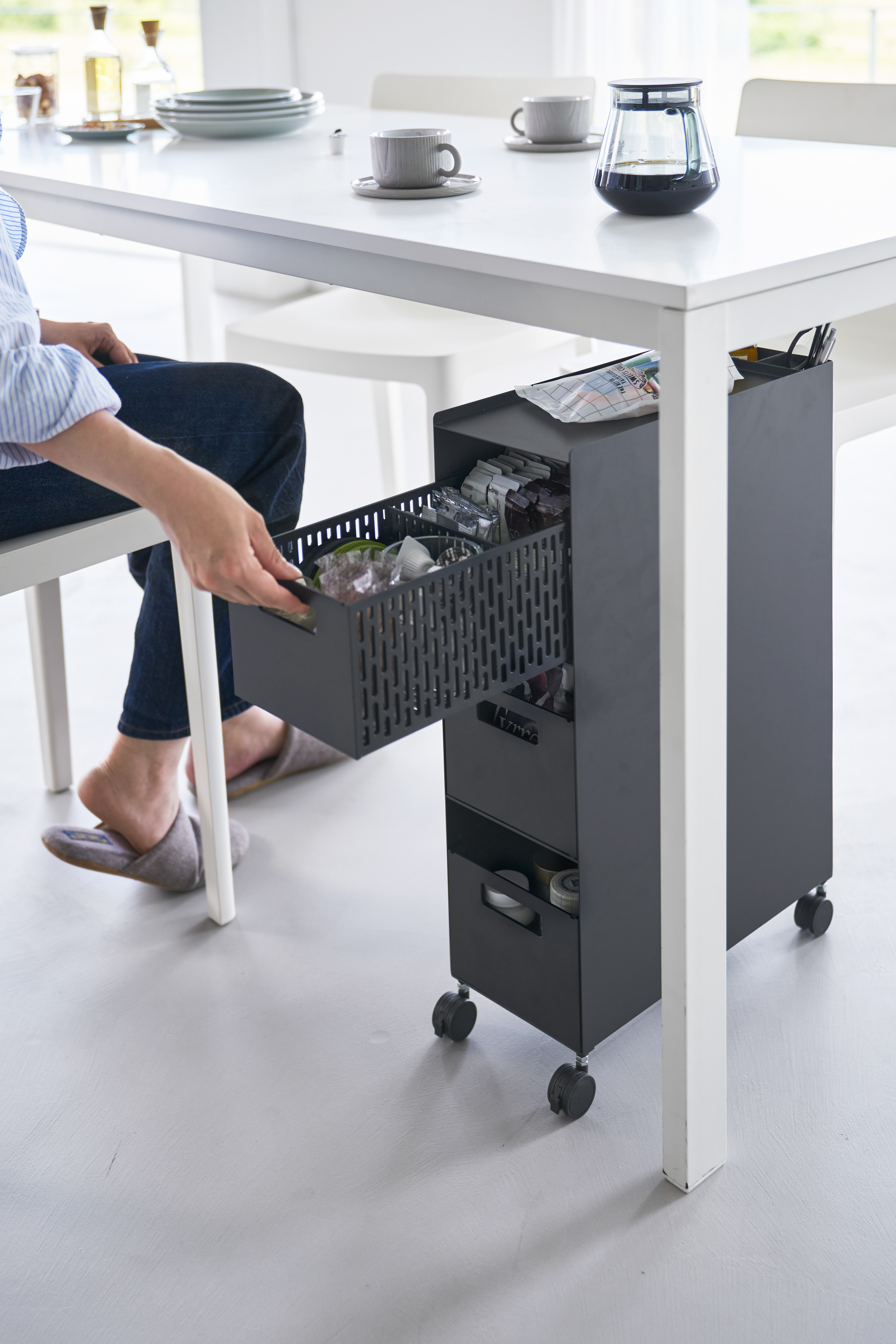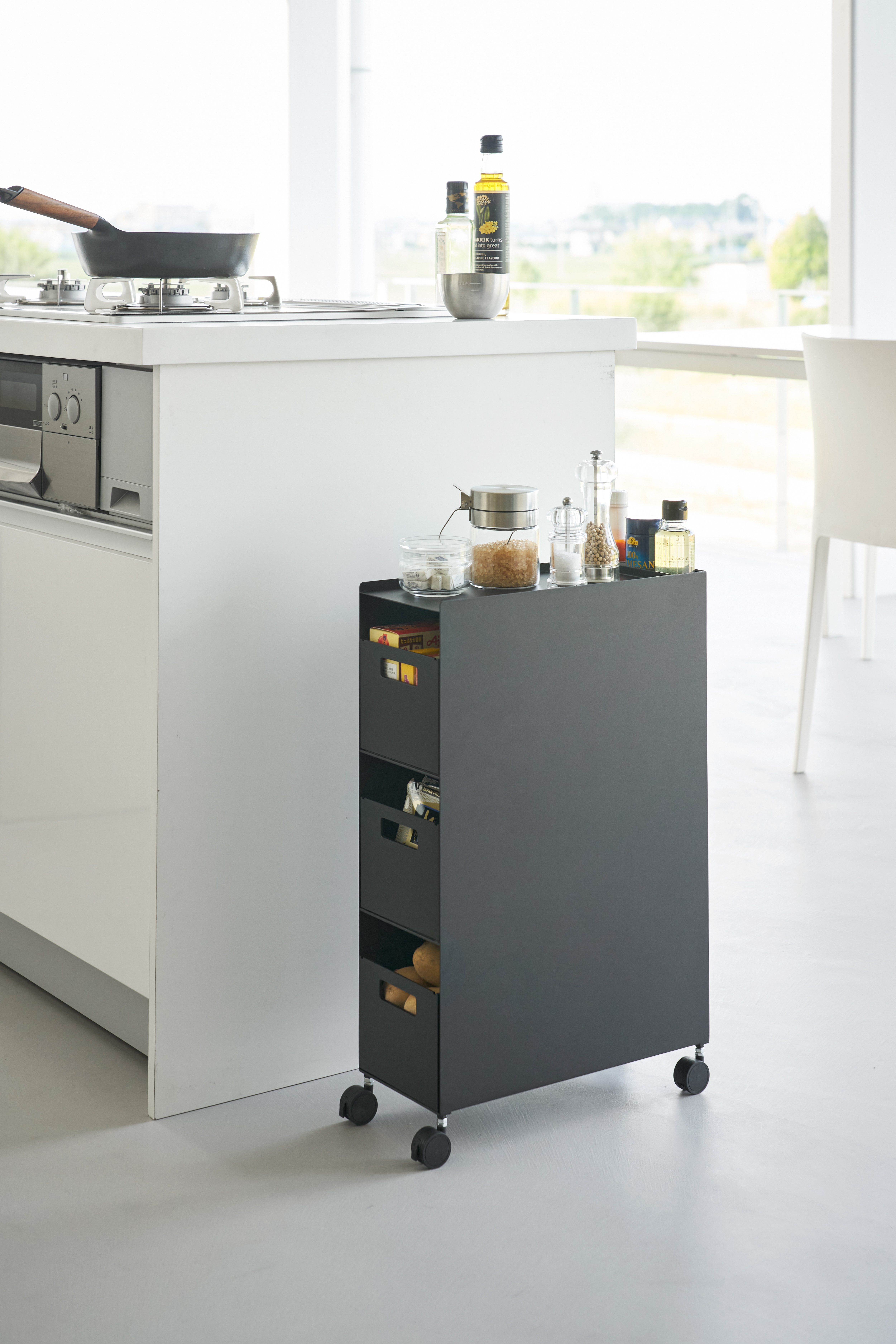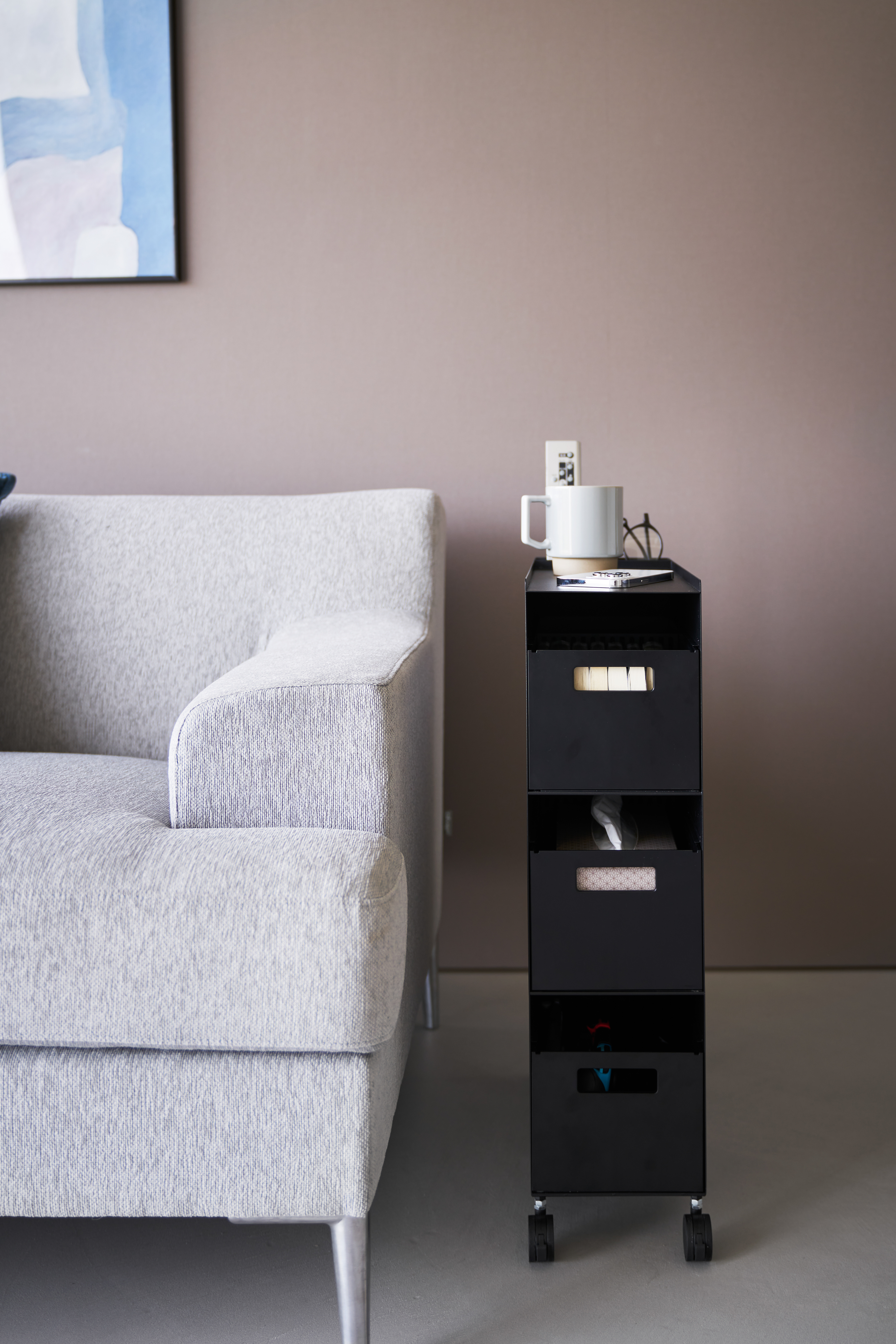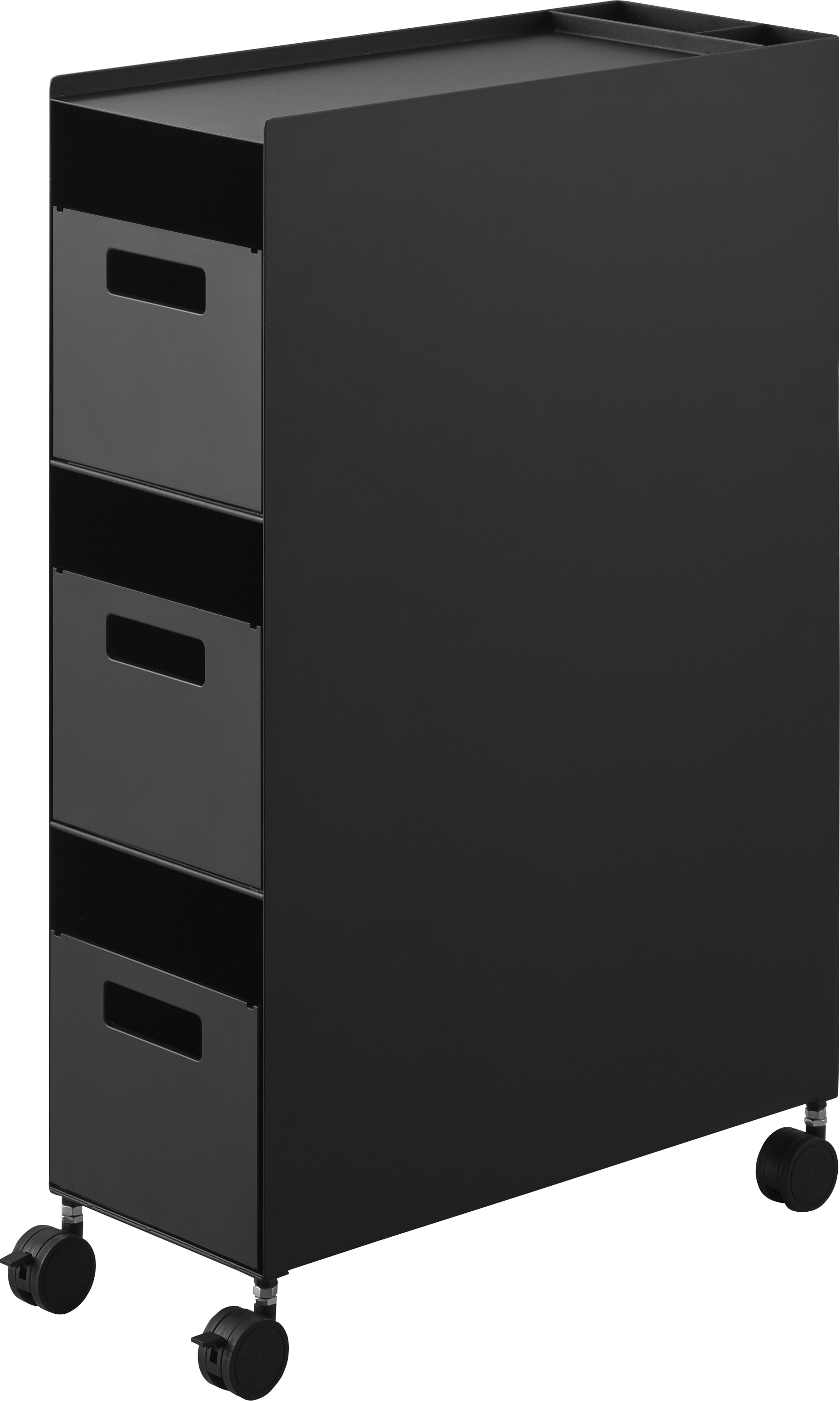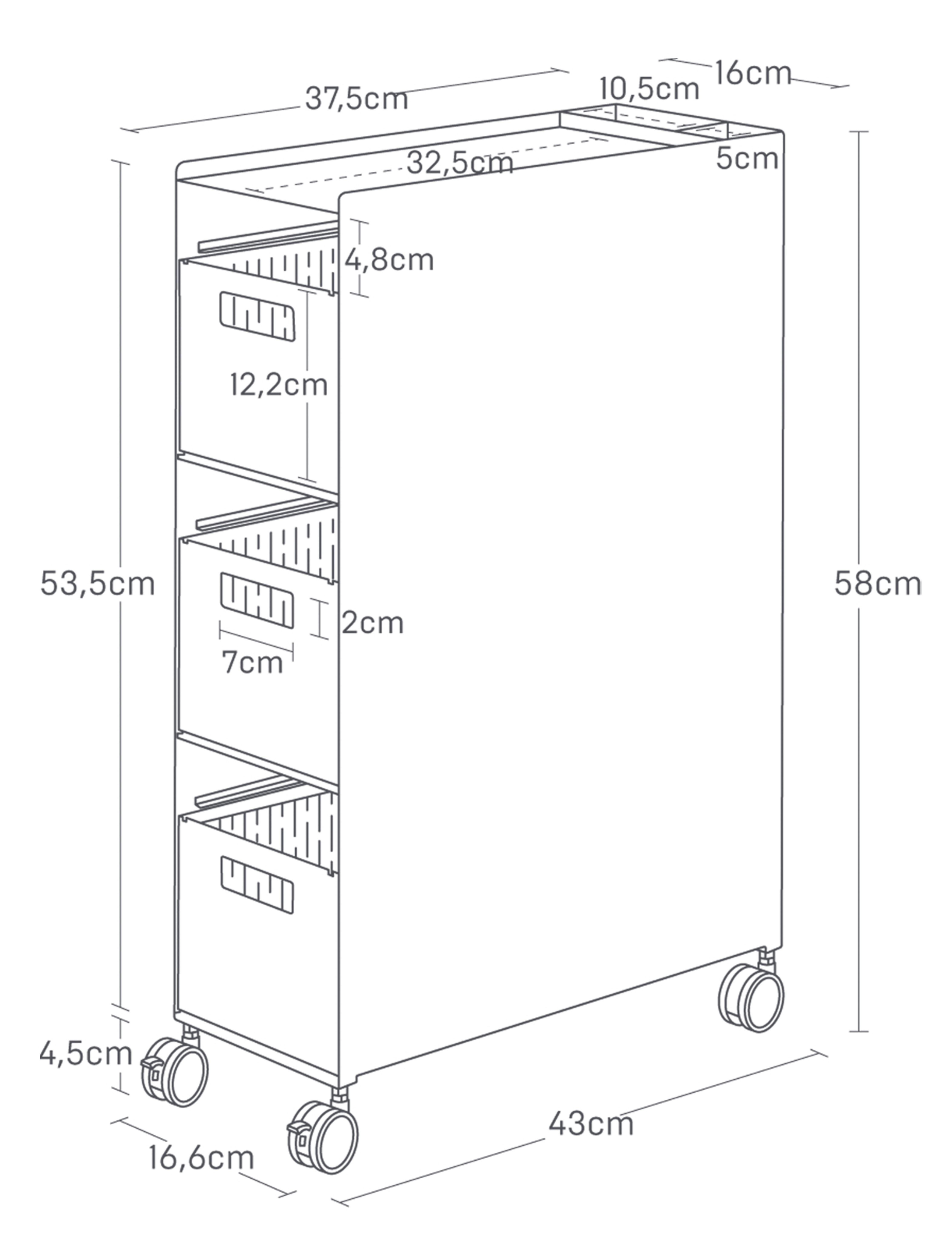 Monikäyttöinen kolmitasoinen laatikosto tuo arkeen selkeyttä ja helpottaa tavaroiden järjestämistä eri tiloissa. Laadukas teräsrakenne yhdistyy tyylikkääseen muotoiluun, jossa kolme irrotettavaa säilytyskoria tarjoavat joustavan ja helposti muokattavan säilytysratkaisun. Jokaisessa korissa on säädettävä välijakaja, jonka avulla sisältö pysyy siististi järjestyksessä.