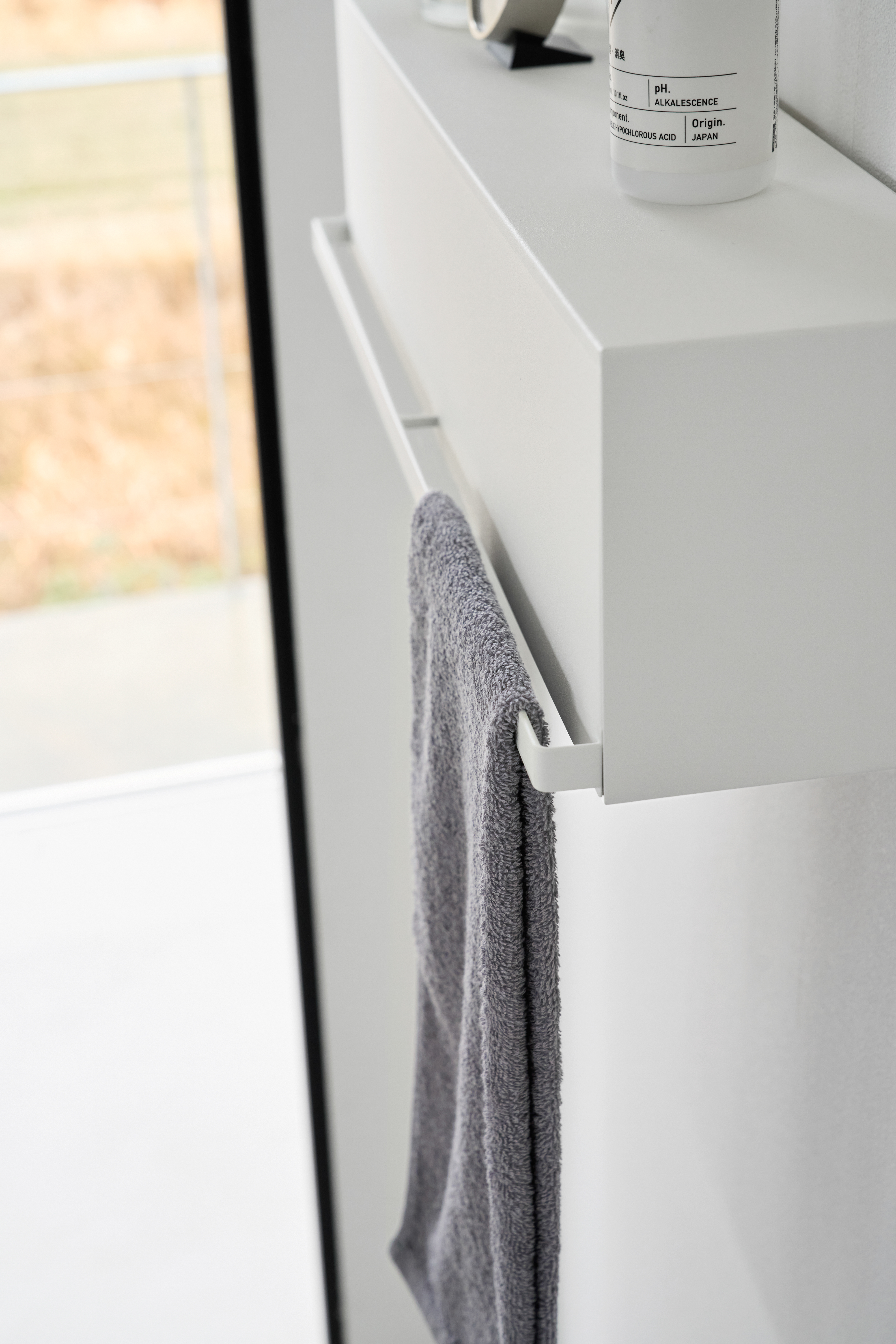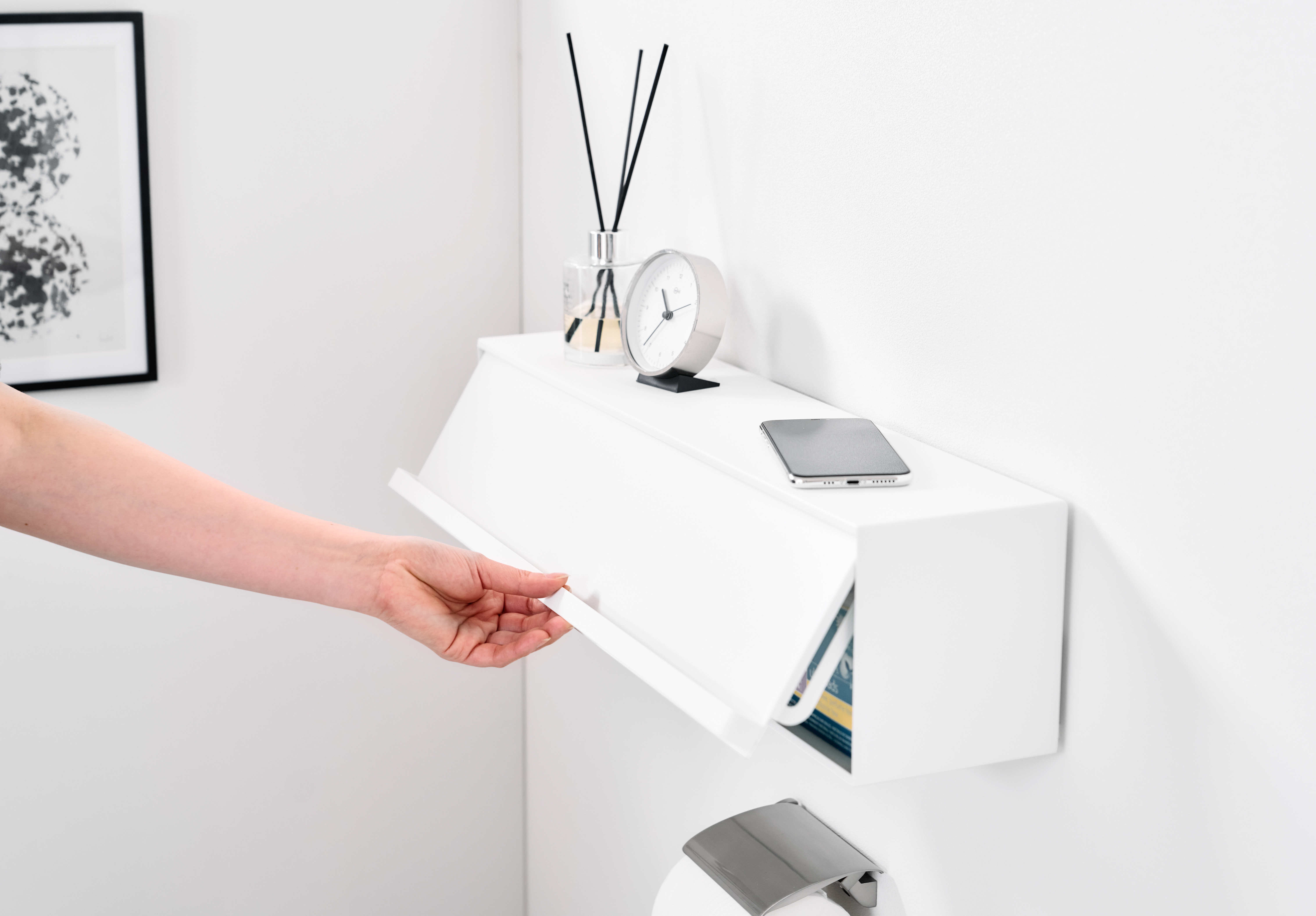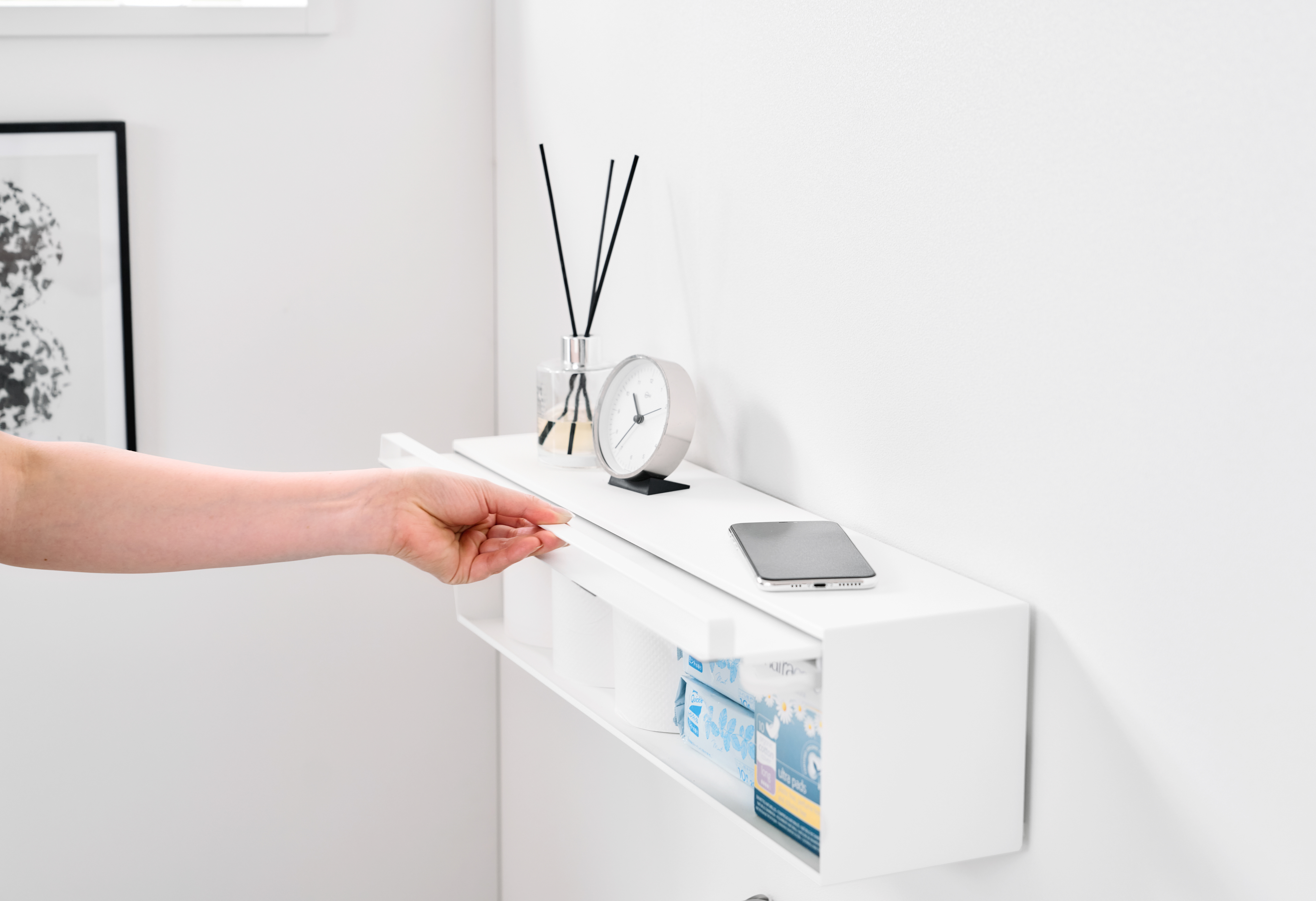 Yamazakin seinään kiinnitettävä hylly tarjoaa tilaa säästävän ja siistin säilytysratkaisun arjen pienille tavaroille. Liukuva kansi kätkee sisällön huomaamattomasti, mutta pitää tavarat helposti saatavilla. Hylly sopii erinomaisesti wc-tilaan tai kodinhoitohuoneeseen, ja sen etureunan kahva toimii kätevästi myös pyyhkeen ripustimena. Selkeä muotoilu ja sulavalinjainen ilme tekevät siitä viimeistellyn lisän moderniin sisustukseen. Maskimipaino ylähyllyllä 1 kg, alahyllyllä 2 kg. Materiaali teräs, POM, ABS, polyester, silikoni. Suunniteltu Japanissa.