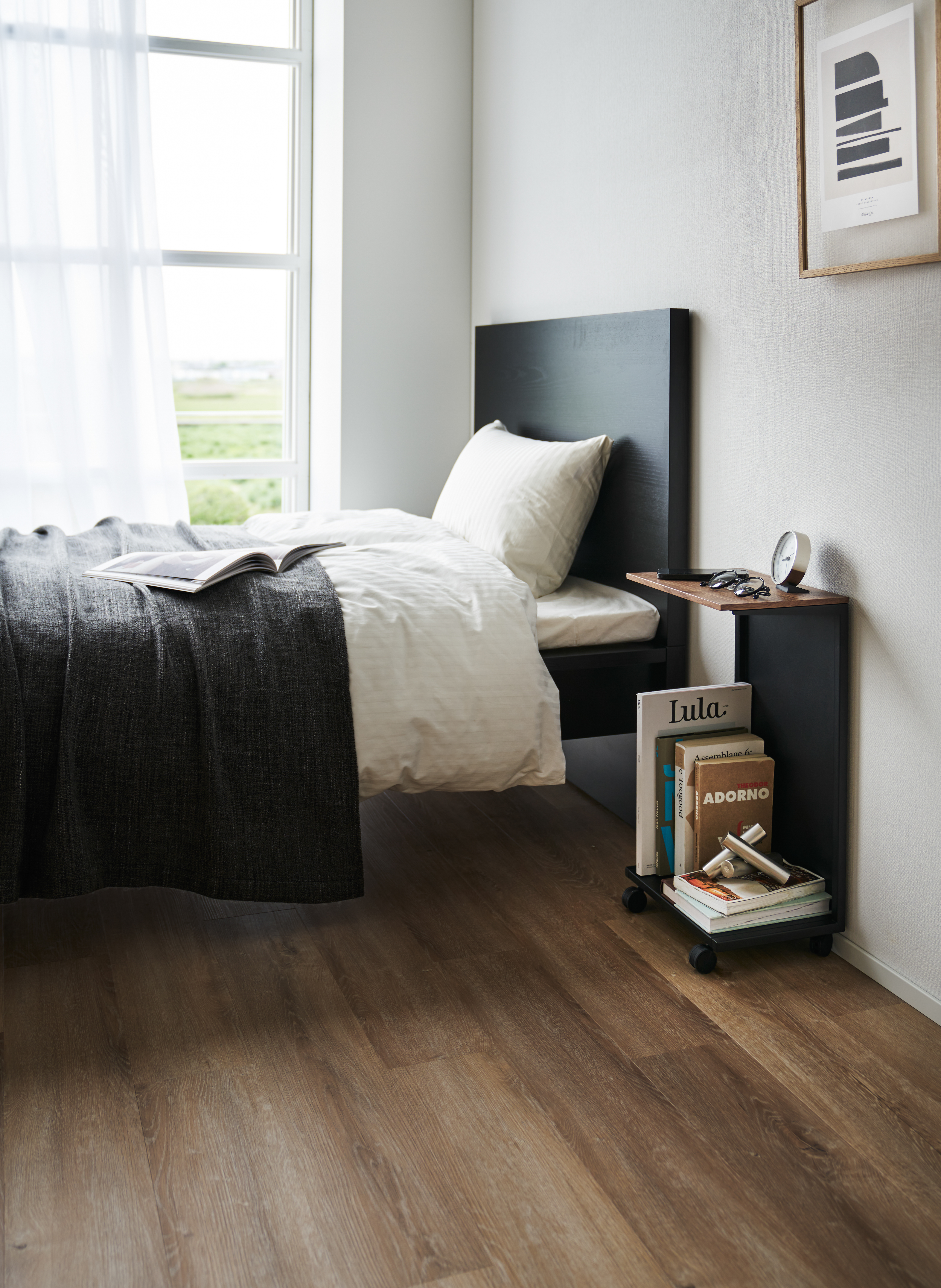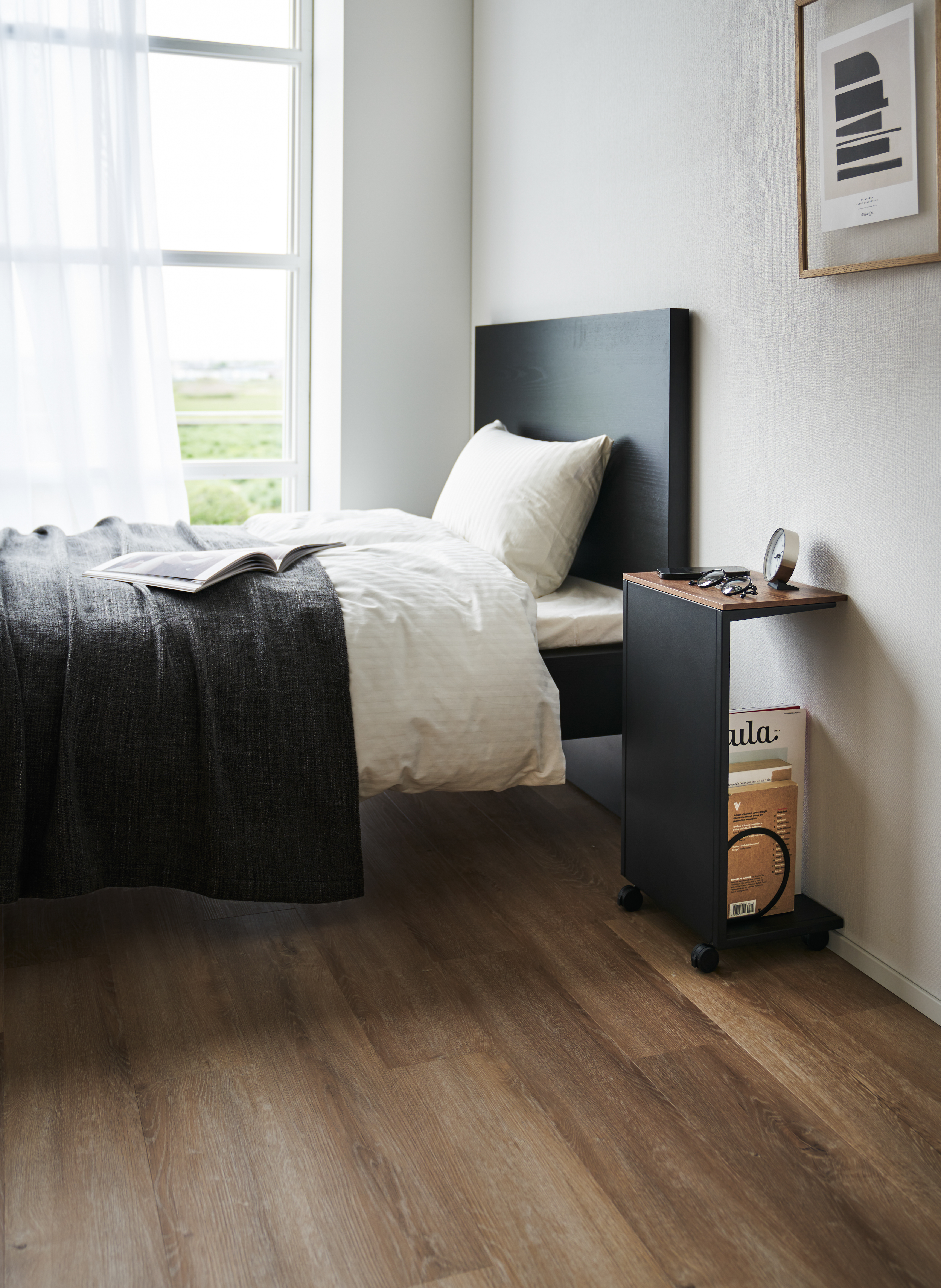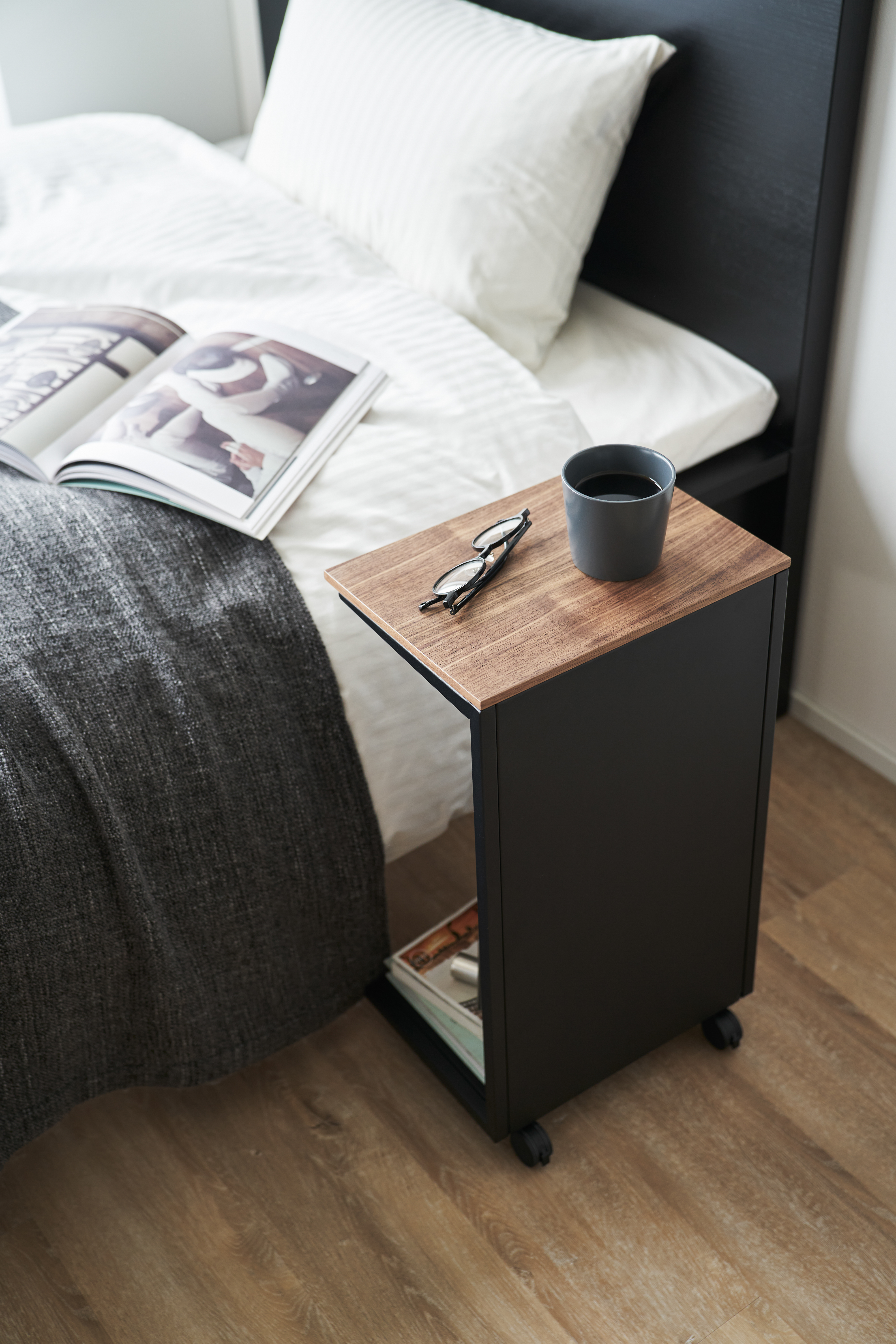 Yamazakin rullattava sivupöytä on käytännöllinen ja tyylikäs ratkaisu arjen säilytykseen. Puisen kannen alle kätkeytyy kätevä tila pientavaroille, ja suljettu taustapaneeli pitää kokonaisuuden siistin näköisenä. Pyörien ansiosta pöytää on helppo liikutella, tai käyttää paikallaan ilman pyöriä. Ajaton muotokieli tekee pöydästä monikäyttöisen lisän niin makuuhuoneeseen, olohuoneeseen kuin työtilaan. Maksimipaino ylätasolla 2,5 kg, alatasolla 5 kg. Materiaali: teräs, puu, Nylon. Suunniteltu Japanissa.