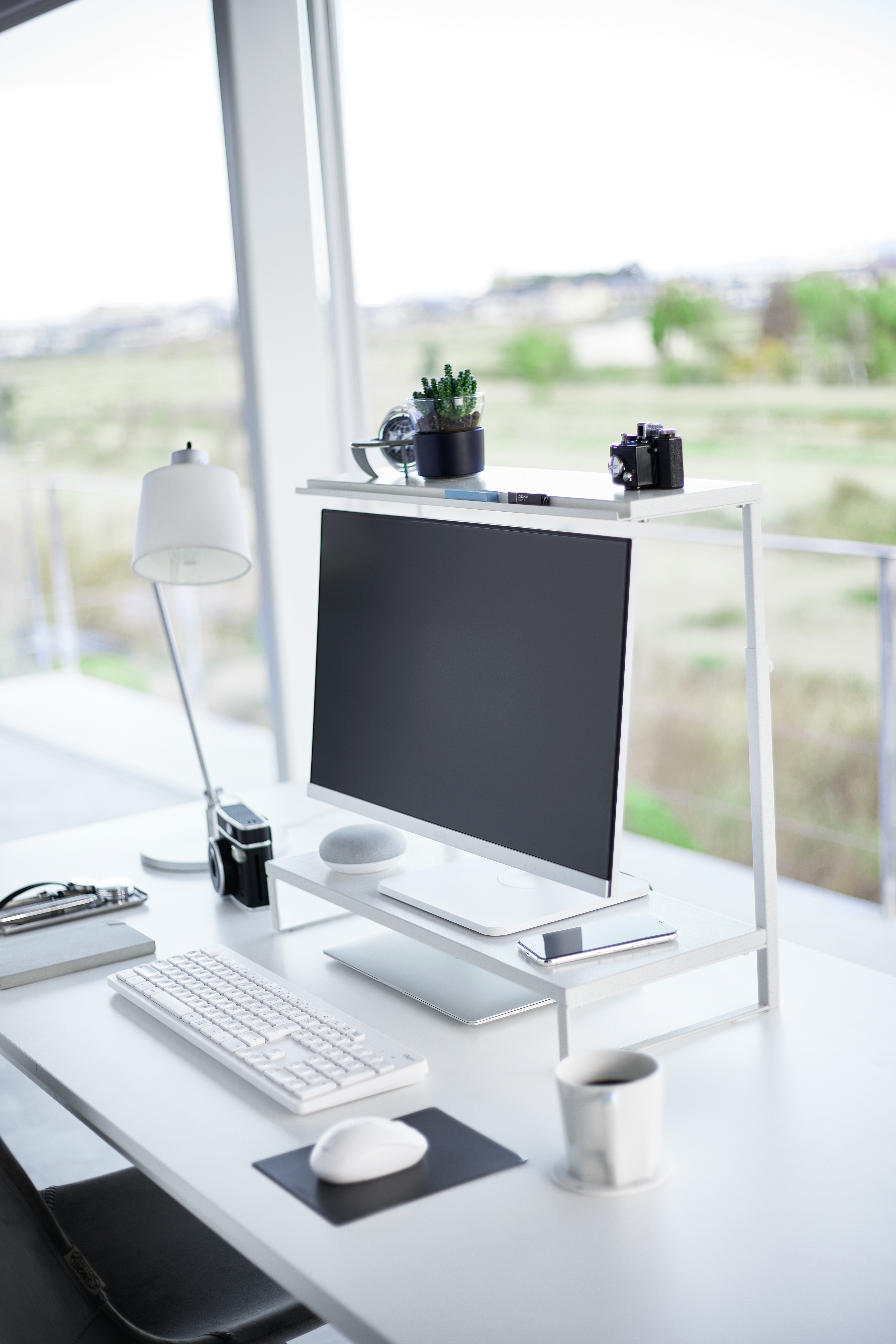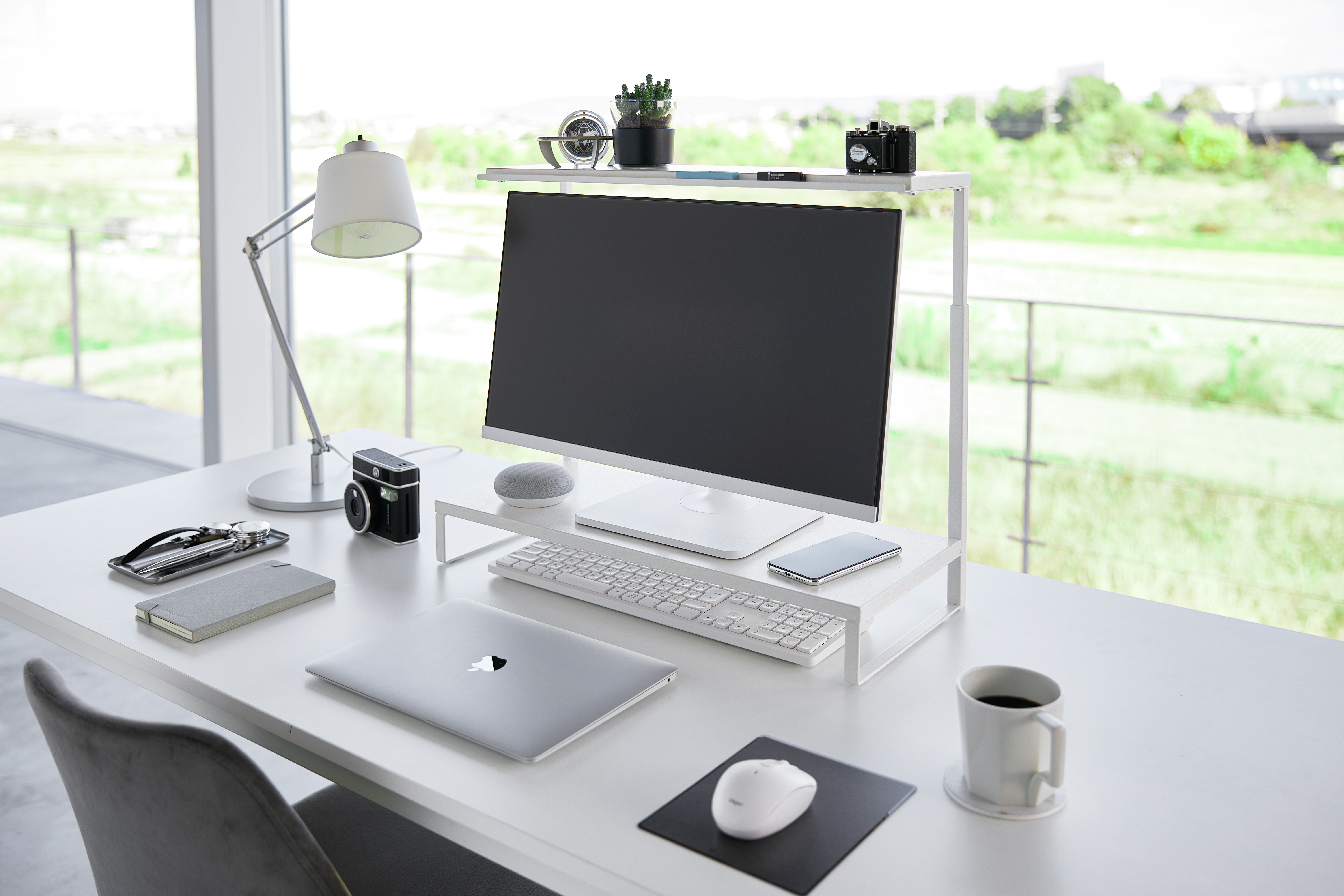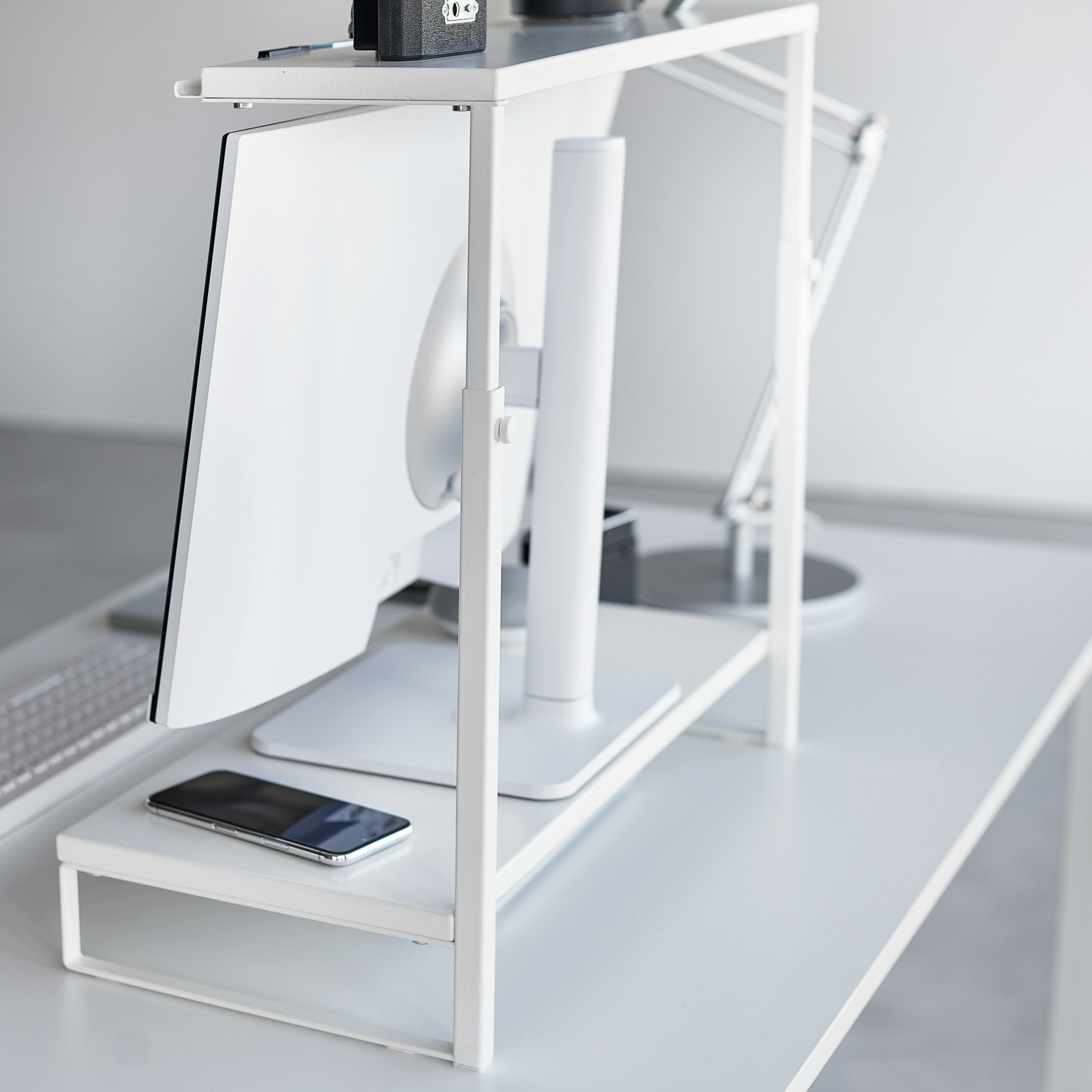 Yamazakin korkeussäädettävä kaksitasoinen näyttöteline nostaa näytön ergonomiselle katselukorkeudelle ja auttaa pitämään työpisteen siistinä. Näppäimistön saa käytön jälkeen kätevästi telineen alle, jolloin pöytätilaa vapautuu muuhun käyttöön. Pelkistetty muotoilu yhdistää käytännöllisyyden ja tyylikkyyden nykyaikaisessa työympäristössä. Maksimipaino ylätasolla 2 kg, alatasolla 10 kg. Materiaali: teräs, Silikoni, PP. Suunniteltu Japanissa.
