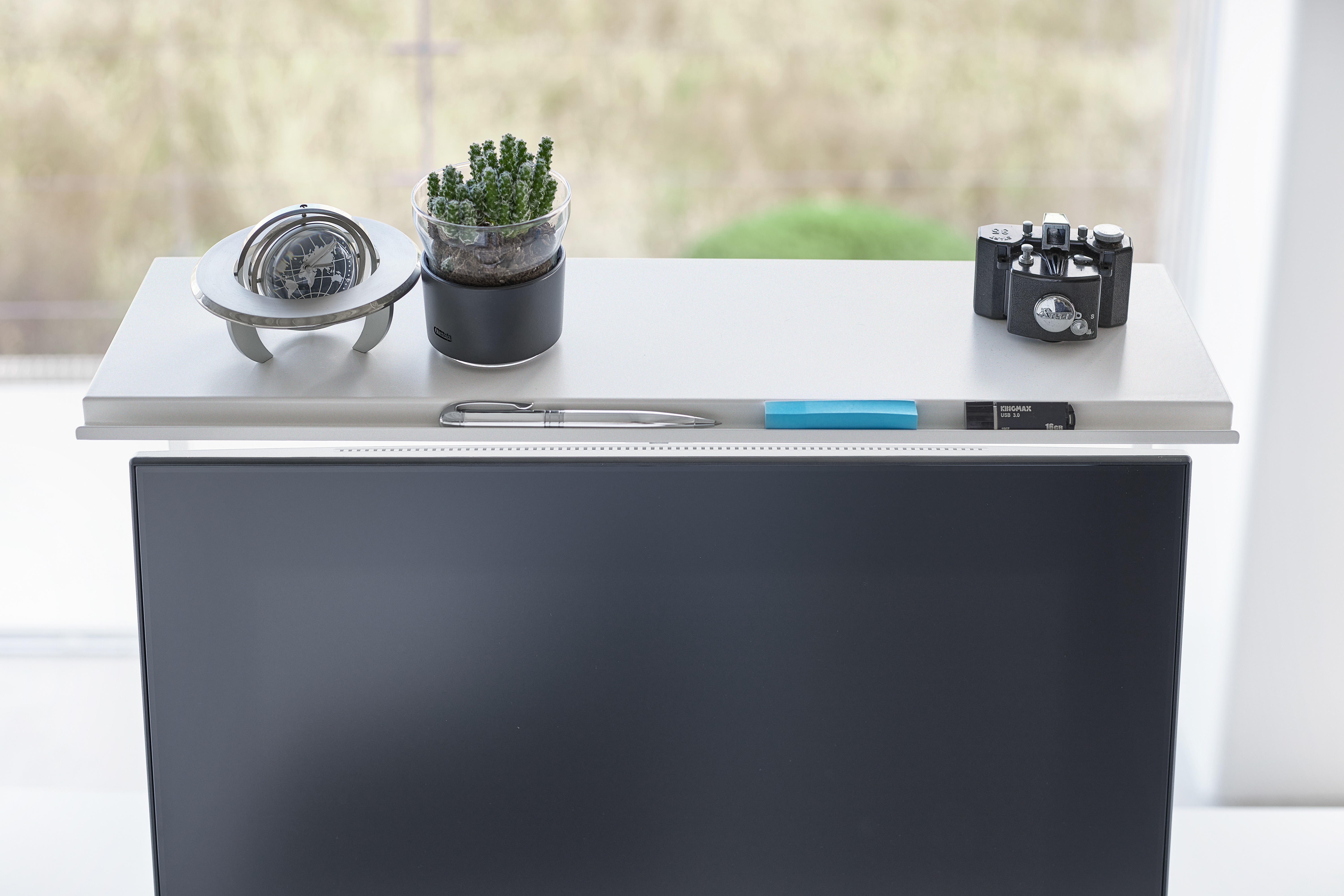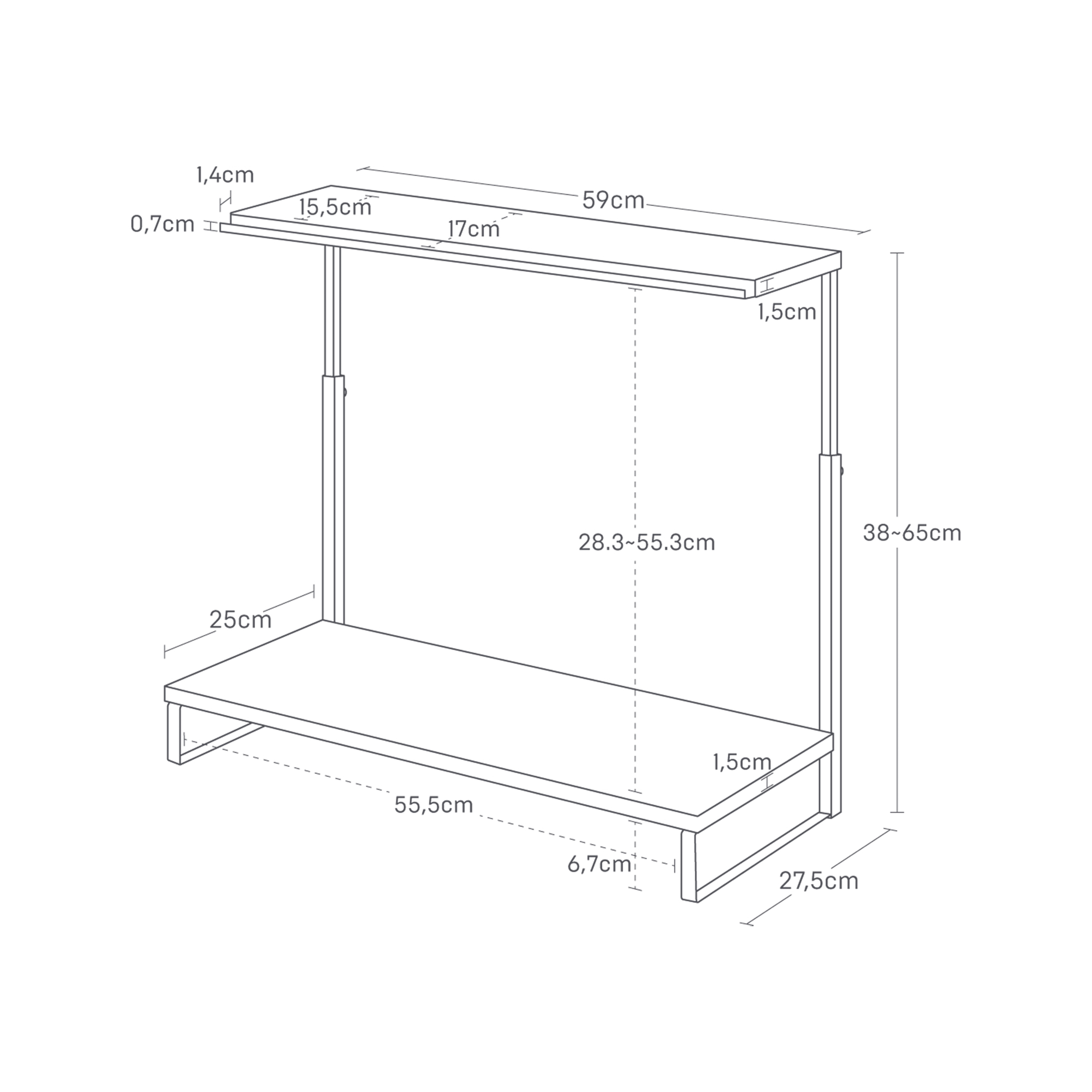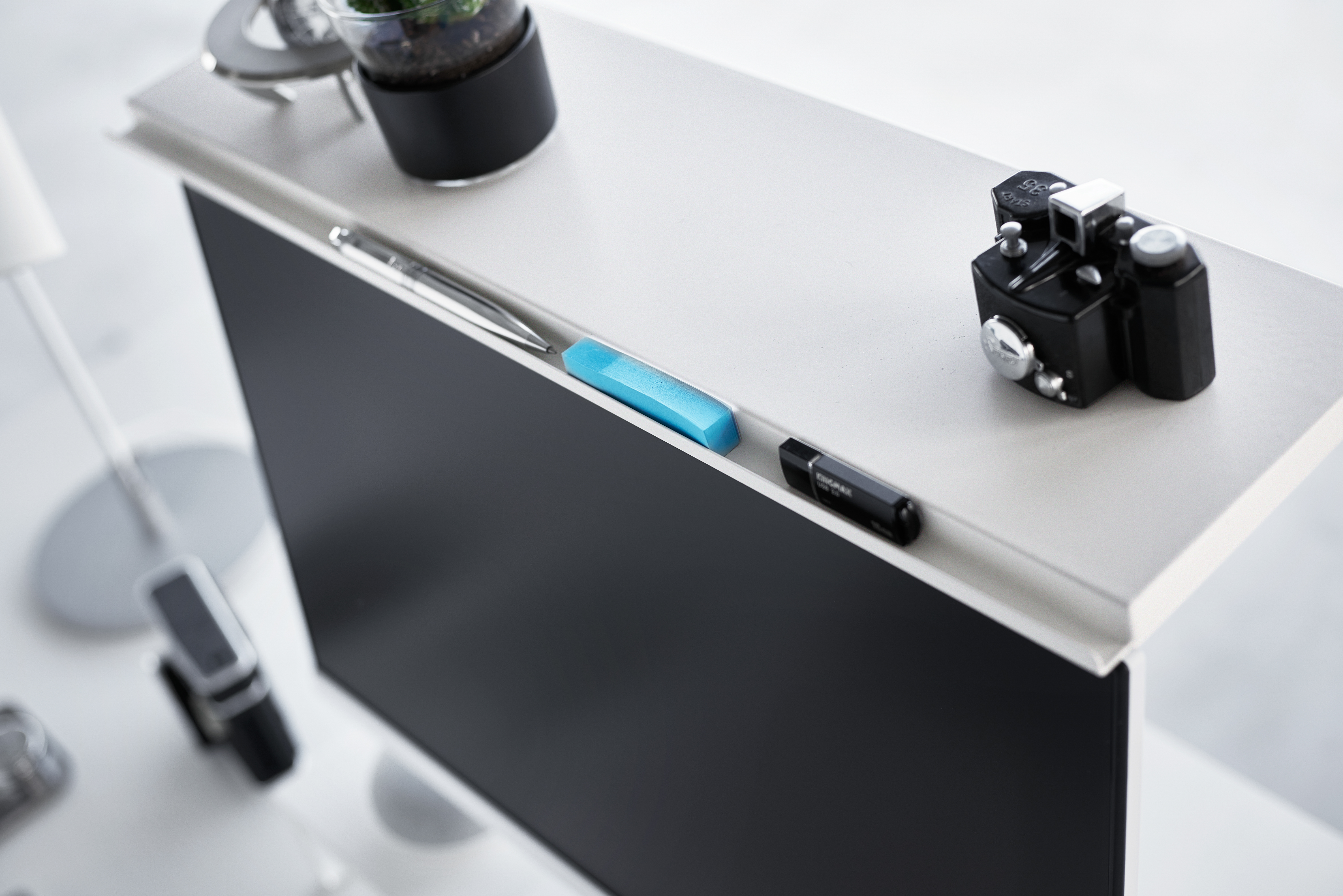 Yamazakin korkeussäädettävä kaksitasoinen näyttöteline nostaa näytön ergonomiselle katselukorkeudelle ja auttaa pitämään työpisteen siistinä. Näppäimistön saa käytön jälkeen kätevästi telineen alle, jolloin pöytätilaa vapautuu muuhun käyttöön. Pelkistetty muotoilu yhdistää käytännöllisyyden ja tyylikkyyden nykyaikaisessa työympäristössä. Maksimipaino ylätasolla 2 kg, alatasolla 10 kg. Materiaali: teräs, Silikoni, PP. Suunniteltu Japanissa.
